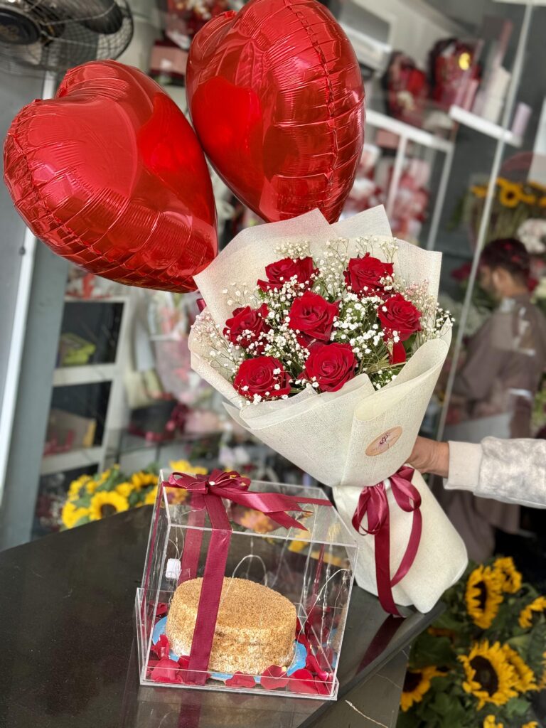 Acrylic Box Birthday Cake with Heart Balloons & Red Rose Petals