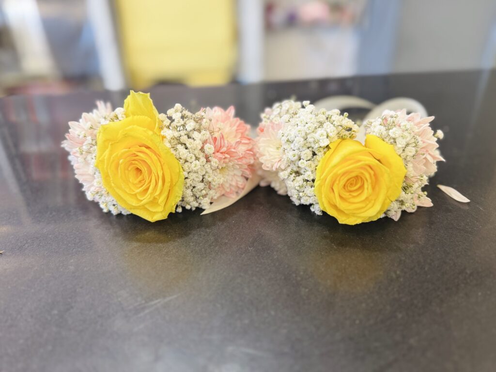 Twin Yellow Rose & Pink Chrysanthemum Wrist Corsages