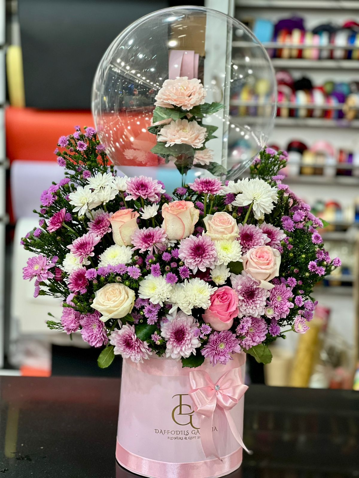 Elegant Pink Rose & Chrysanthemum Box with Floral Bubble