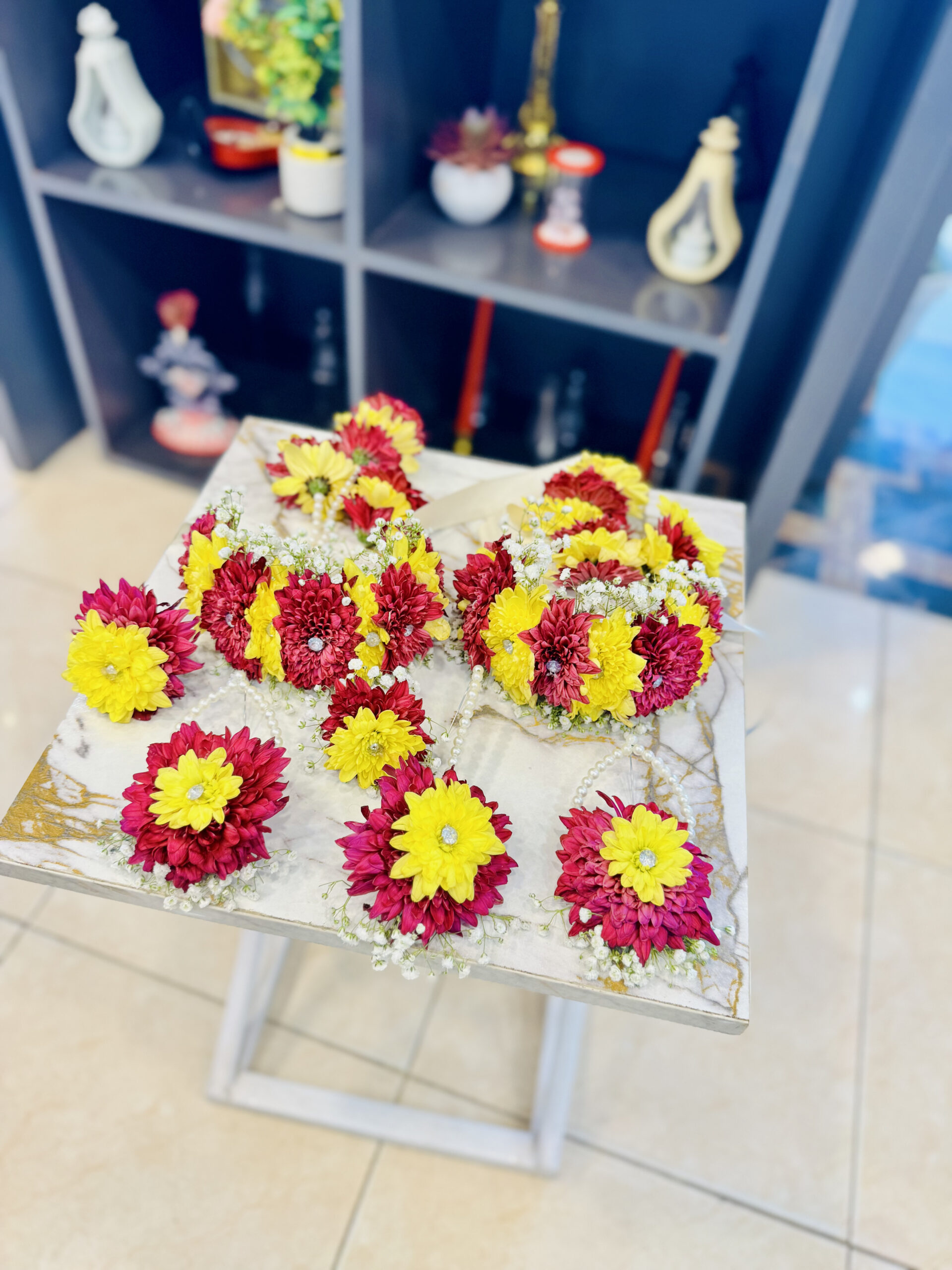 The set is intricately designed using fresh, high-quality chrysanthemums, layered to create a full and luxurious look. Each piece is accented with tiny clusters of white baby’s breath for a soft, ethereal finish. For added elegance, the arrangement includes small crystal-like studs in the center of the flowers and is strung together with delicate white pearls.