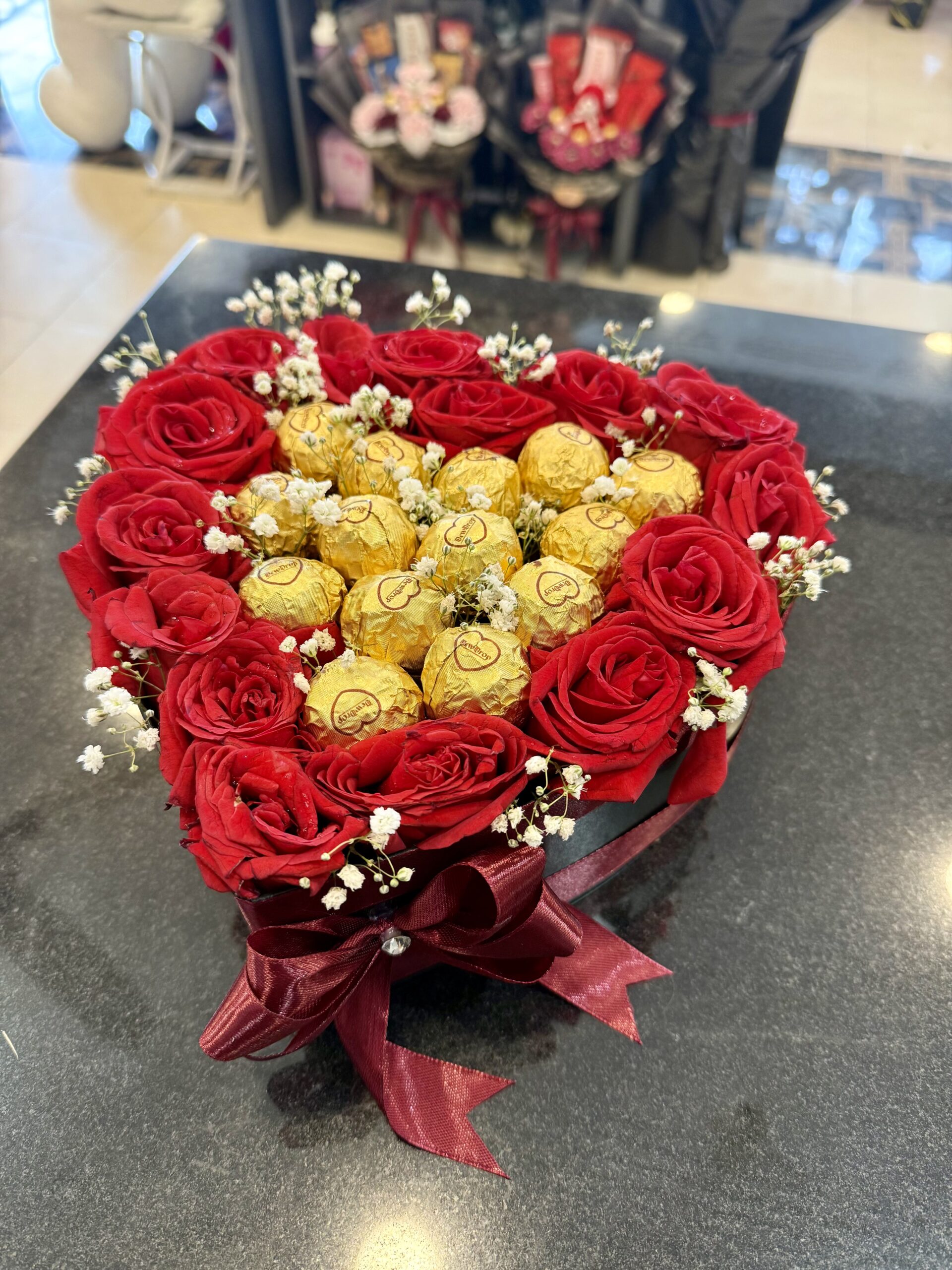 At the center, delicious Ferrero chocolates are perfectly arranged, adding a sweet and luxurious touch to the gift. The combination of rich red roses and golden-wrapped chocolates creates a classic and elegant look, symbolizing love, passion, and indulgence.