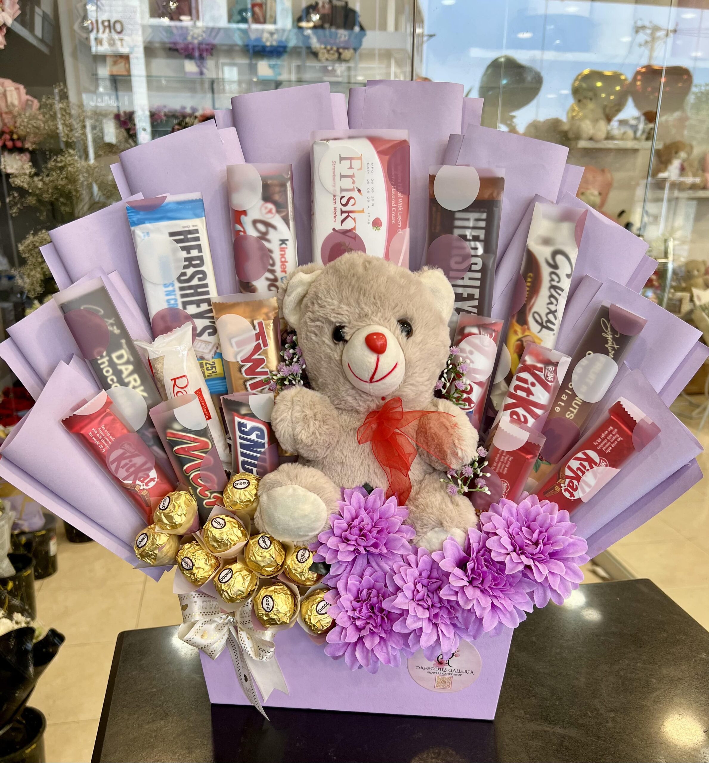 The bouquet is built around an adorable, plush teddy bear with a warm smile, ready to be a cherished companion. Surrounding this lovable bear is a lavish assortment of popular chocolate bars from brands like Hershey’s, Galaxy, Kinder Bueno, KitKat, and Snickers. The arrangement is further enriched with a cluster of luxurious Ferrero Rocher chocolates, adding a touch of golden opulence.
