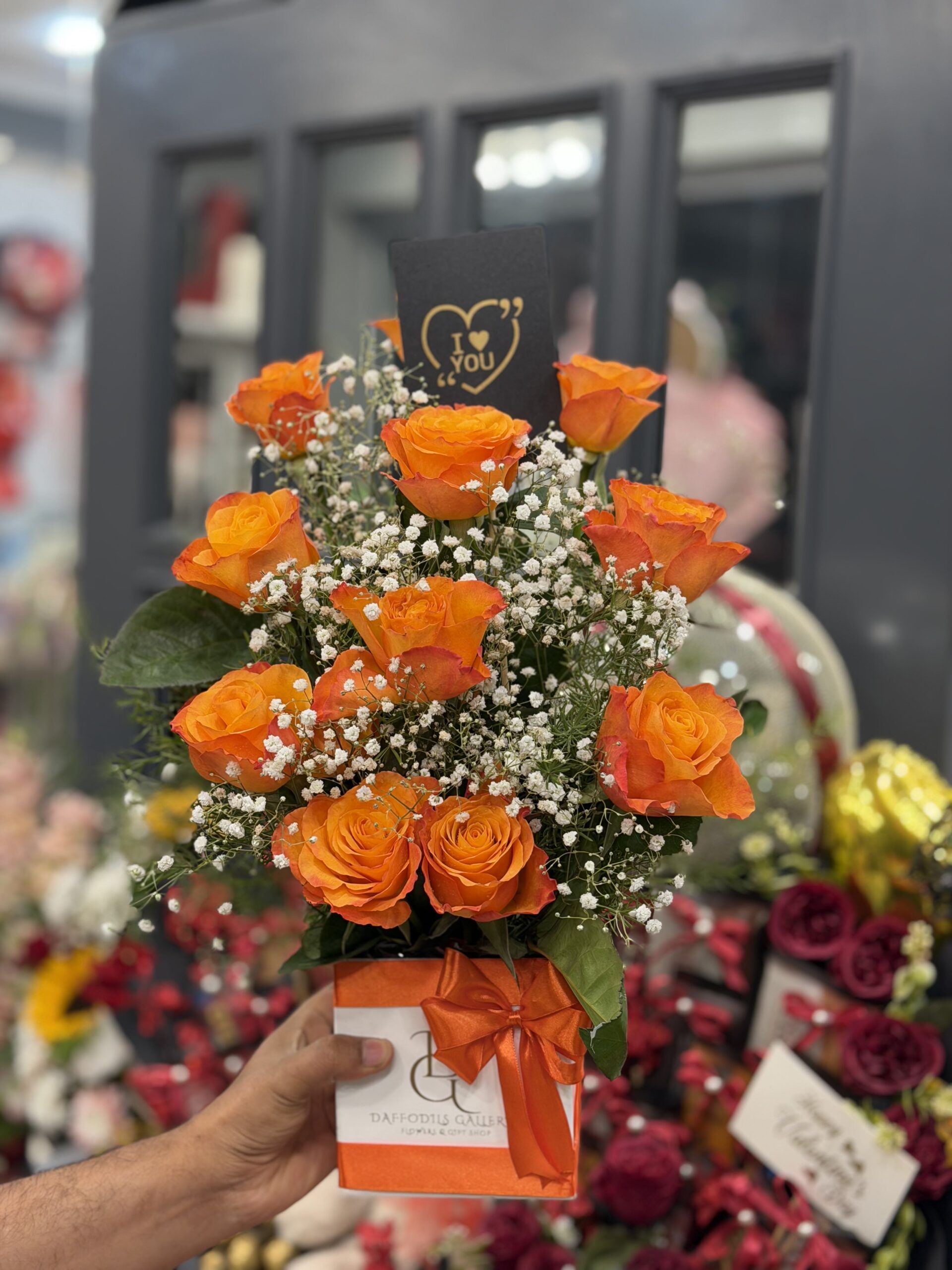 A vibrant arrangement of fresh orange roses with baby breath in a stylish box, topped with an “I Love You” card. Perfect for romantic and cheerful gifting.