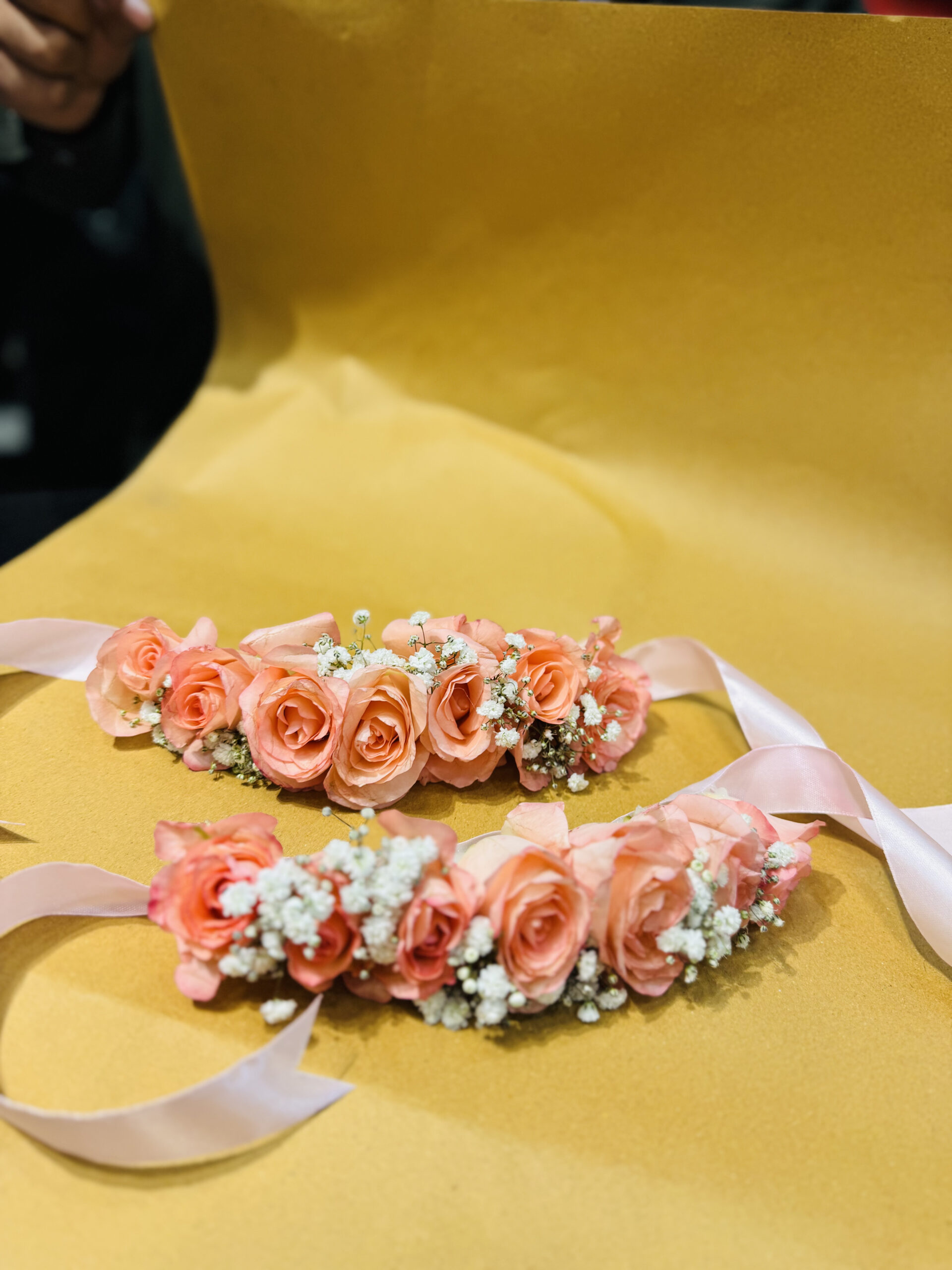 A stunning handmade floral accessory featuring fresh, soft peach roses and delicate white Baby’s Breath. Designed with adjustable satin ribbons, this piece is perfect for brides, bridesmaids, or festive occasions in Bahawalpur looking for a touch of natural elegance.