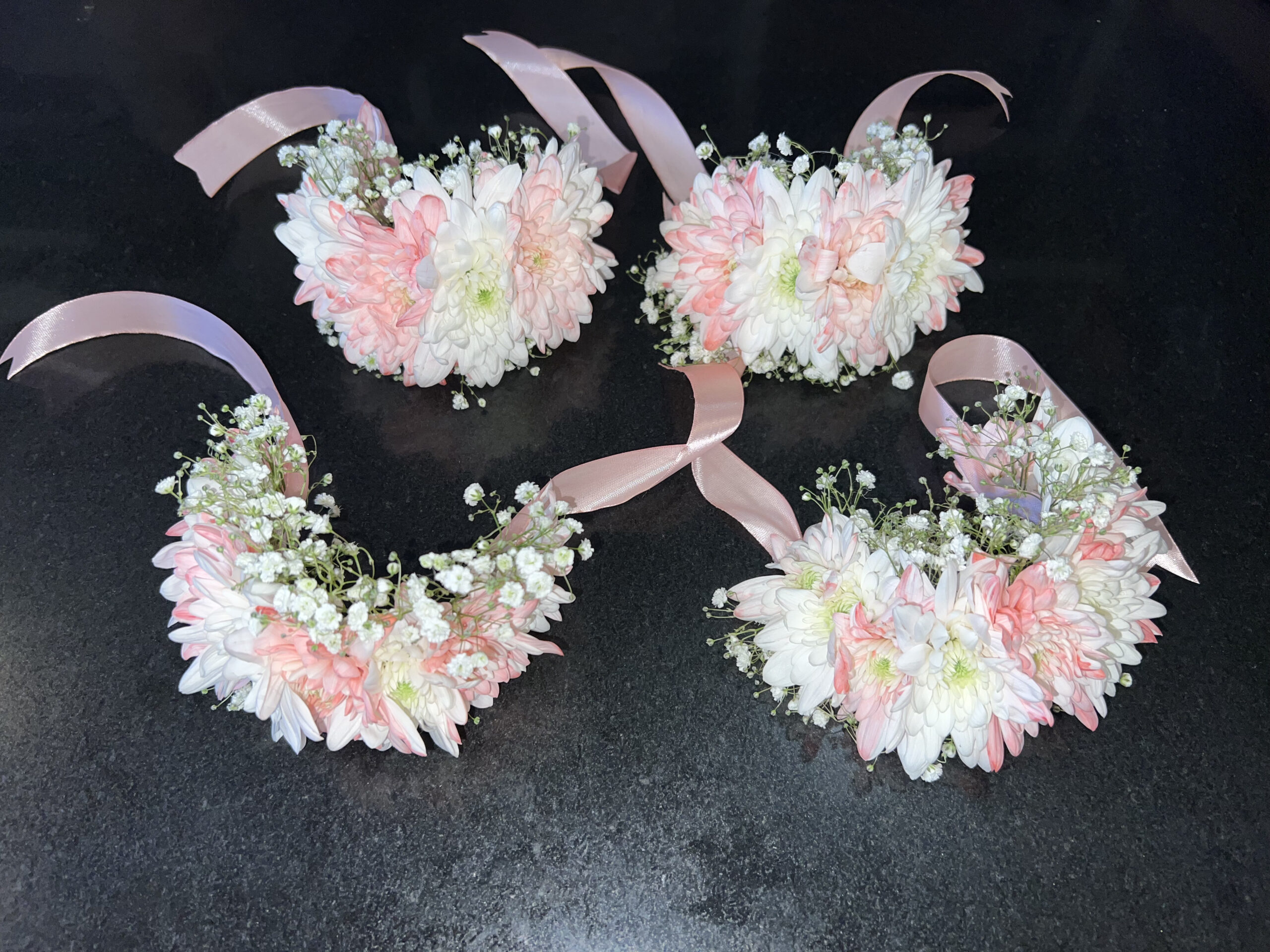 Flower Type & Arrangement Style This exquisite floral accessory is handcrafted using fresh, multi-petaled Chrysanthemums (Gul-e-Daudi) and delicate sprays of Baby’s Breath (Gypsophila). The flowers are meticulously arranged in a crescent shape to sit comfortably on the wrist, secured by a high-quality, shimmering pink satin ribbon that adds a touch of elegance and ensures a perfect fit for any wrist size.