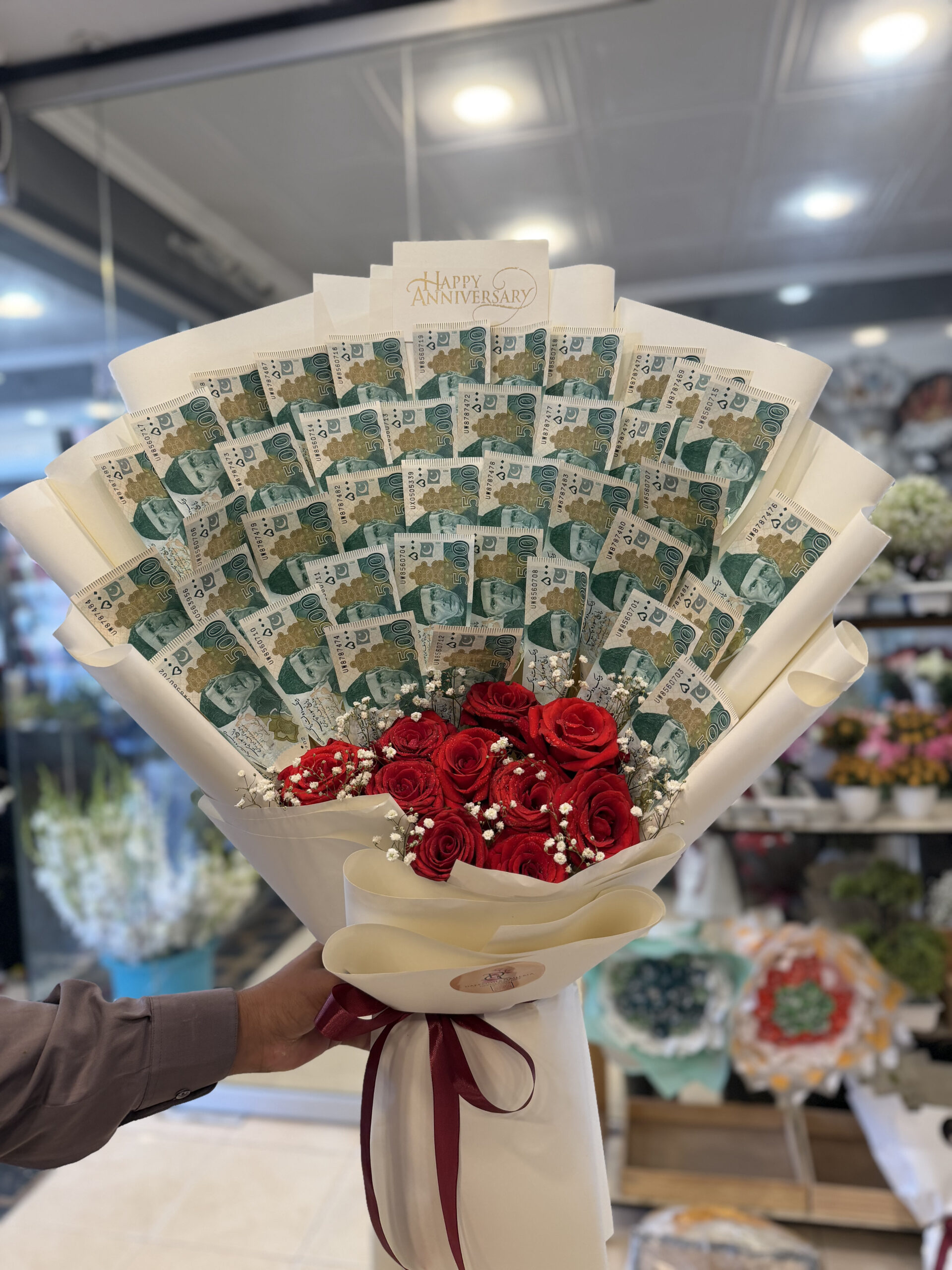 Make a grand gesture with this stunning fusion of fresh red roses and crisp PKR 500 currency notes. Elegantly wrapped in cream parchment and finished with a “Happy Anniversary” card, it is the ultimate gift of love and prosperity for your special someone in Bahawalpur.