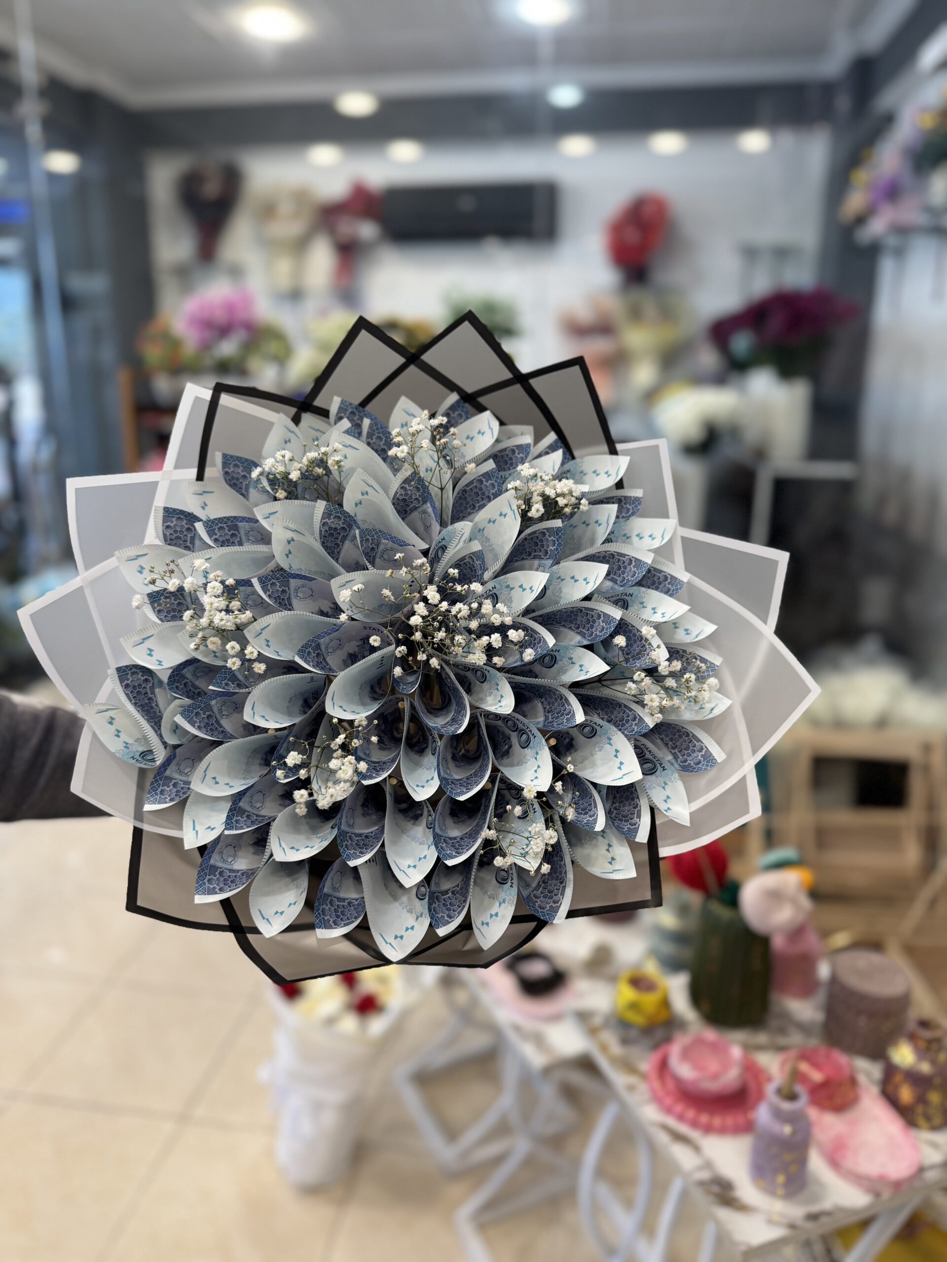 To balance the bold look of the currency, we have interspersed sprigs of fresh white Baby’s Breath throughout the arrangement. This adds a soft, organic touch of elegance and texture. The bouquet is finished with premium dual-tone black and white structural wrapping, giving it a modern, sharp, and sophisticated silhouette.