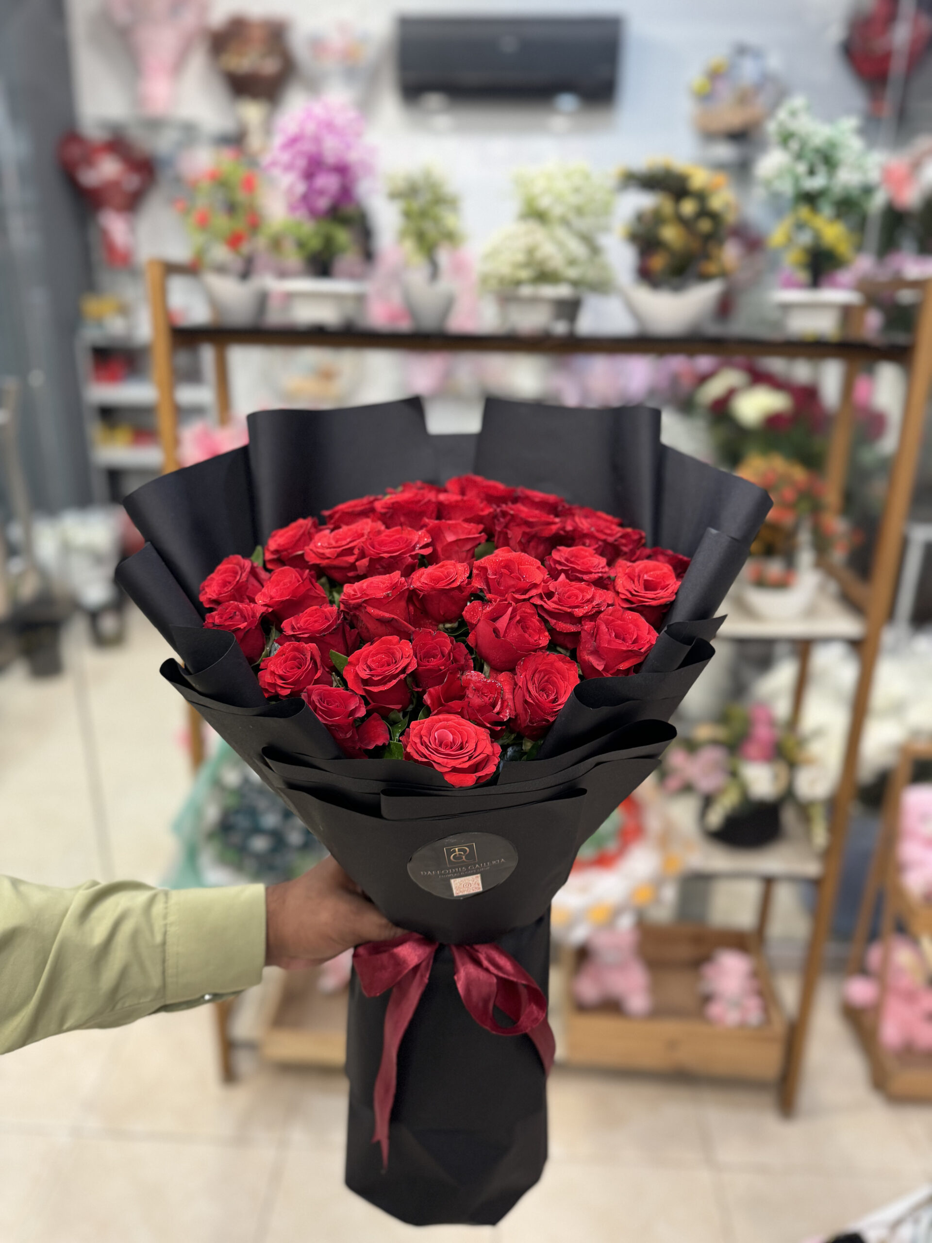 Make a bold statement with our Premium Red Rose Bouquet. This arrangement features a dense, lush collection of hand-picked red roses, known for their vibrant color and velvety texture. The striking contrast between the fiery red blooms and the sleek, matte black premium wrapping creates a modern yet timeless look that stands out in any setting.