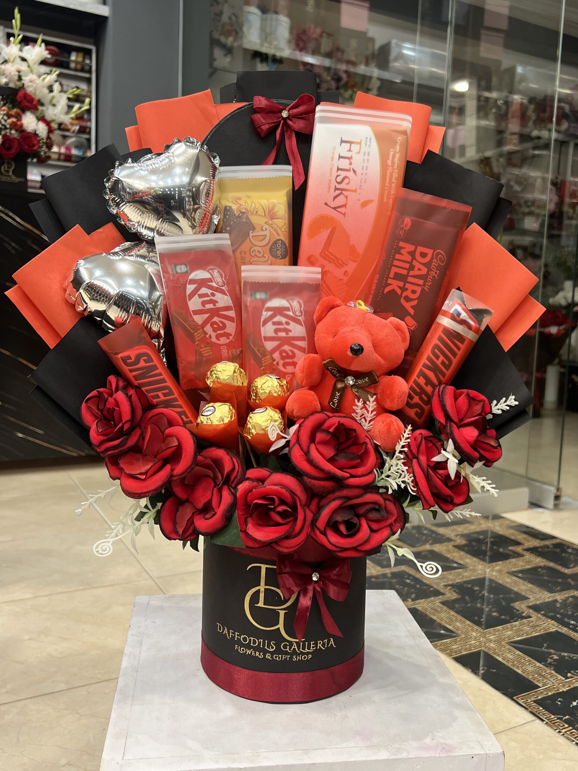 The arrangement is beautifully accented with luxurious artificial red roses and elegant silver heart-shaped balloons, creating a visually striking and romantic display. All these wonderful treats are expertly arranged and presented in a sophisticated black and gold box with red and black wrapping, tied with a matching ribbon. The “Scarlet Surprise” bouquet is an unforgettable gift for anniversaries, Valentine’s Day, or any occasion where you want to show your love in a grand and dramatic way.