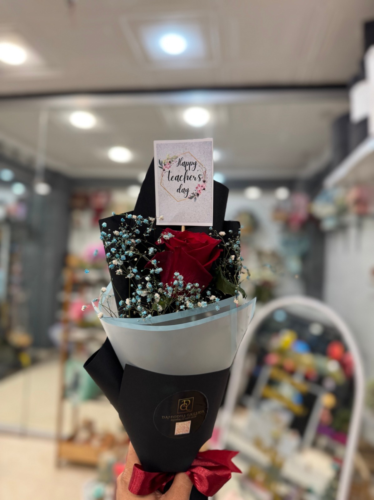A striking deep red rose nestled in premium black and frosted wrapping, accented with delicate blue-tinted baby’s breath. This elegant single-stem arrangement is the perfect thoughtful gesture for Teachers’ Day, anniversaries, or a simple “thank you.”