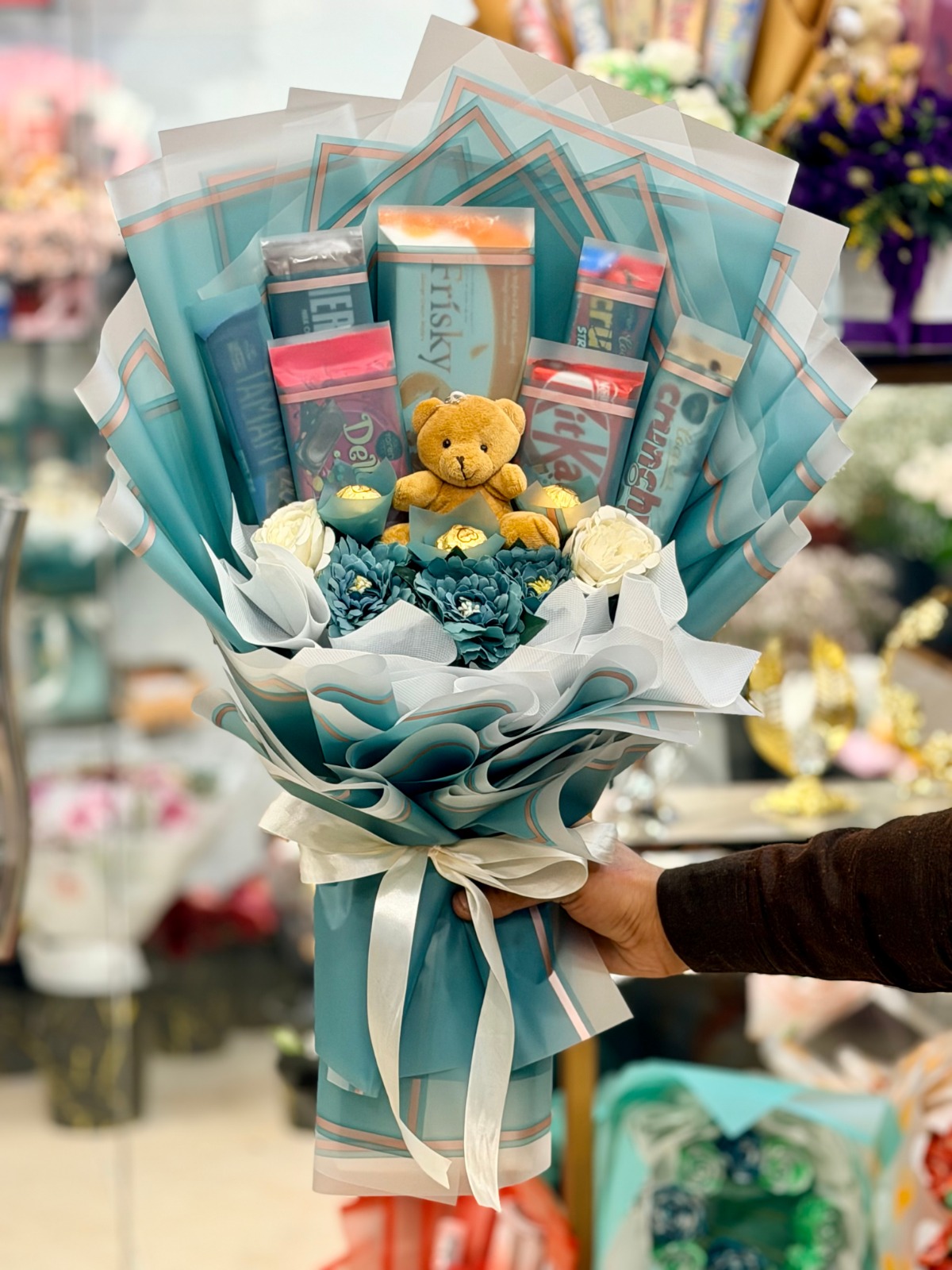 Celebrate your special moments with a gift that offers more than just beauty. Our Teal & Treats Chocolate Bouquet is a masterfully crafted arrangement designed to impress. Instead of a traditional floral-only display, this bouquet features a curated selection of popular chocolates, including KitKat, Crunch, and Ferrero Rocher, ensuring a delicious experience for the recipient.