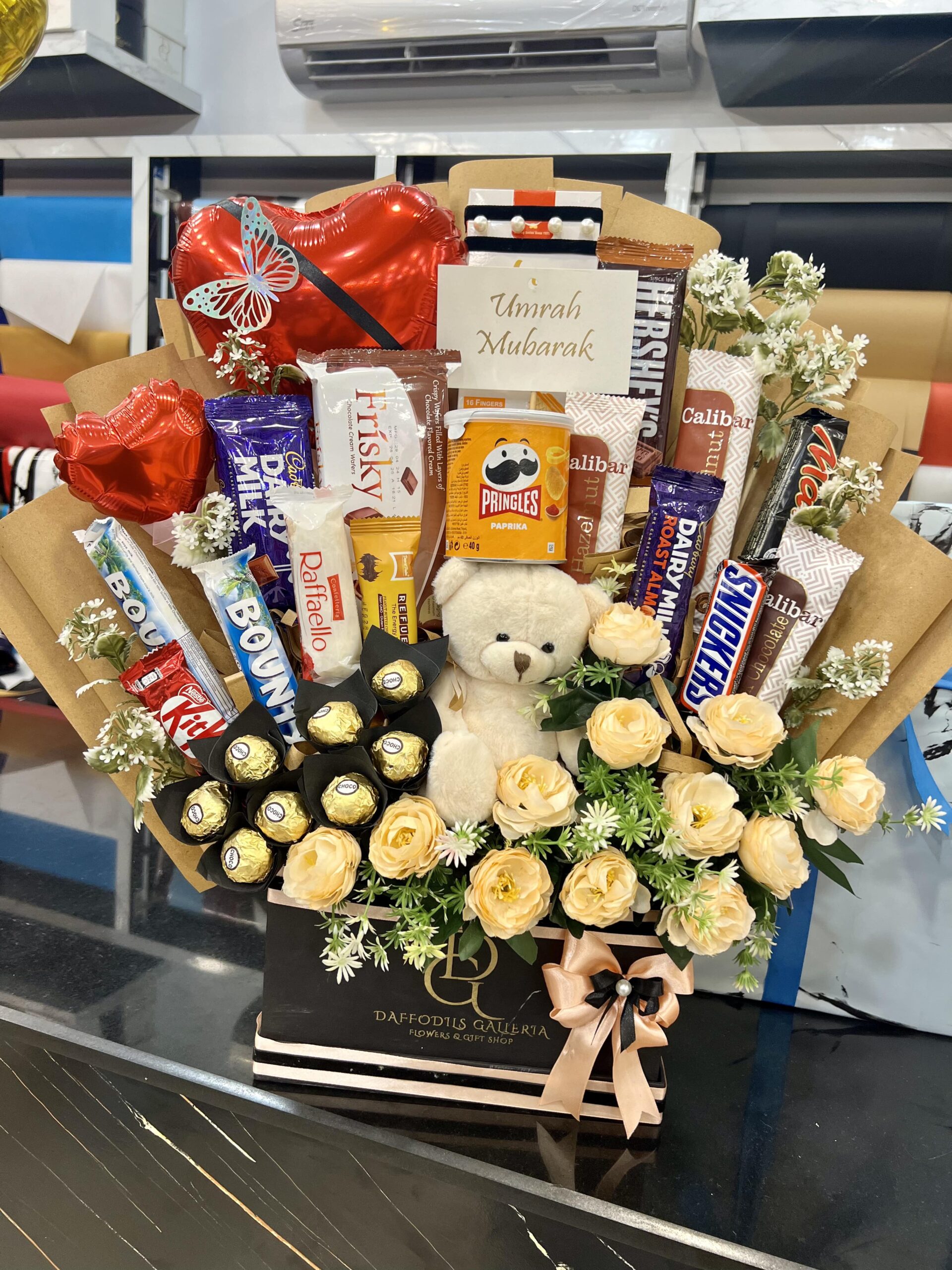 Celebrate the blessed journey of Hajj or Umrah with our “Umrah Mubarak” Gift Box. This thoughtful and festive arrangement is a perfect way to congratulate a loved one on their pilgrimage. The gift box features a delightful mix of gourmet chocolates, including Ferrero Rocher and popular favorites like KitKat, Snickers, and Hershey’s, alongside a can of Pringles for a savory touch. A small, cuddly teddy bear is nestled in the center, providing a sweet reminder of your affection.