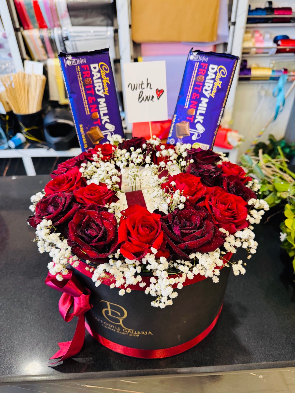 Premium Presentation The flowers are elegantly housed in a high-quality matte black hat box, finished with a signature gold logo and a matching crimson satin ribbon. Standing tall at the back are two full-sized Cadbury Dairy Milk Fruit & Nut chocolate bars, paired with a heartfelt “With Love” card, making it a complete gift package.